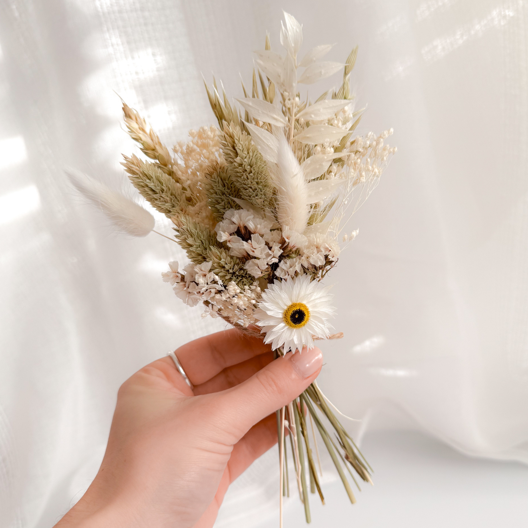 Elevate your home decor with this stunning handmade dried flower arrangement, standing at 30cm tall. This bouquet features a delightful mix of phalaris, daisy, bunny tails & more.  It’s the perfect size for styling on a shelf, side table, or windowsill.